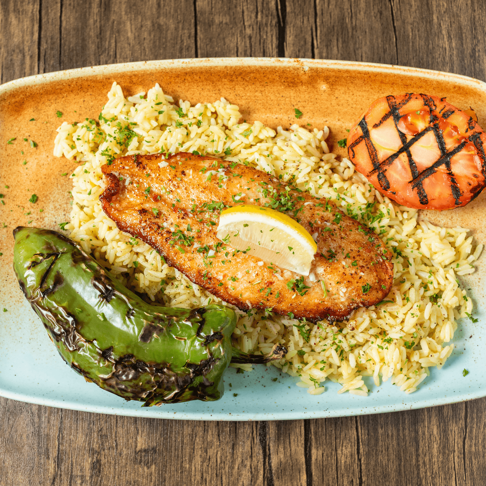Seasoned filet pan-cooked with lemon juice & garlic, served with rice pilaf & grilled vegetables