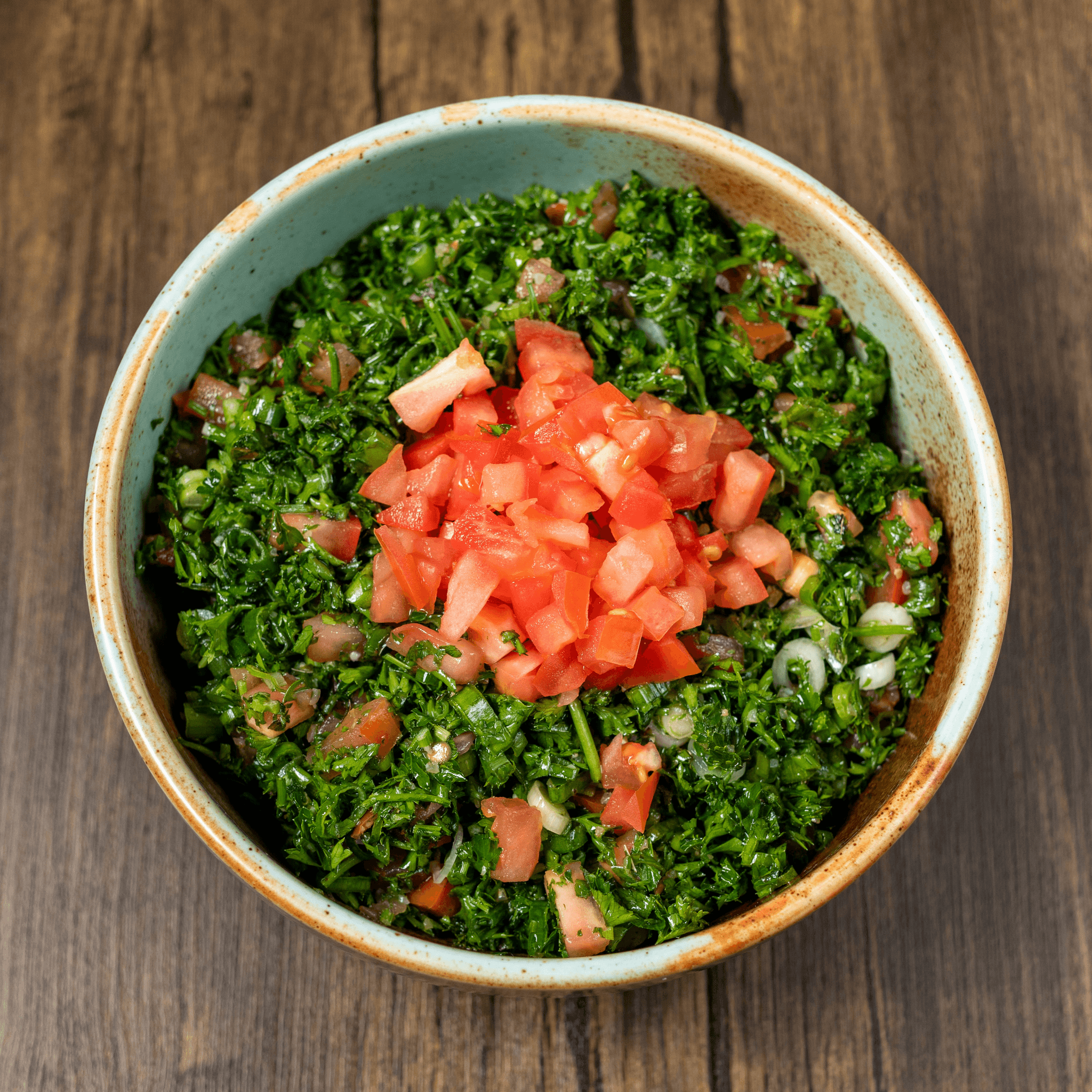 Vegan. Chopped parsley salad with tomatoes, green onions, cracked wheat, olive oil & lemon juice
