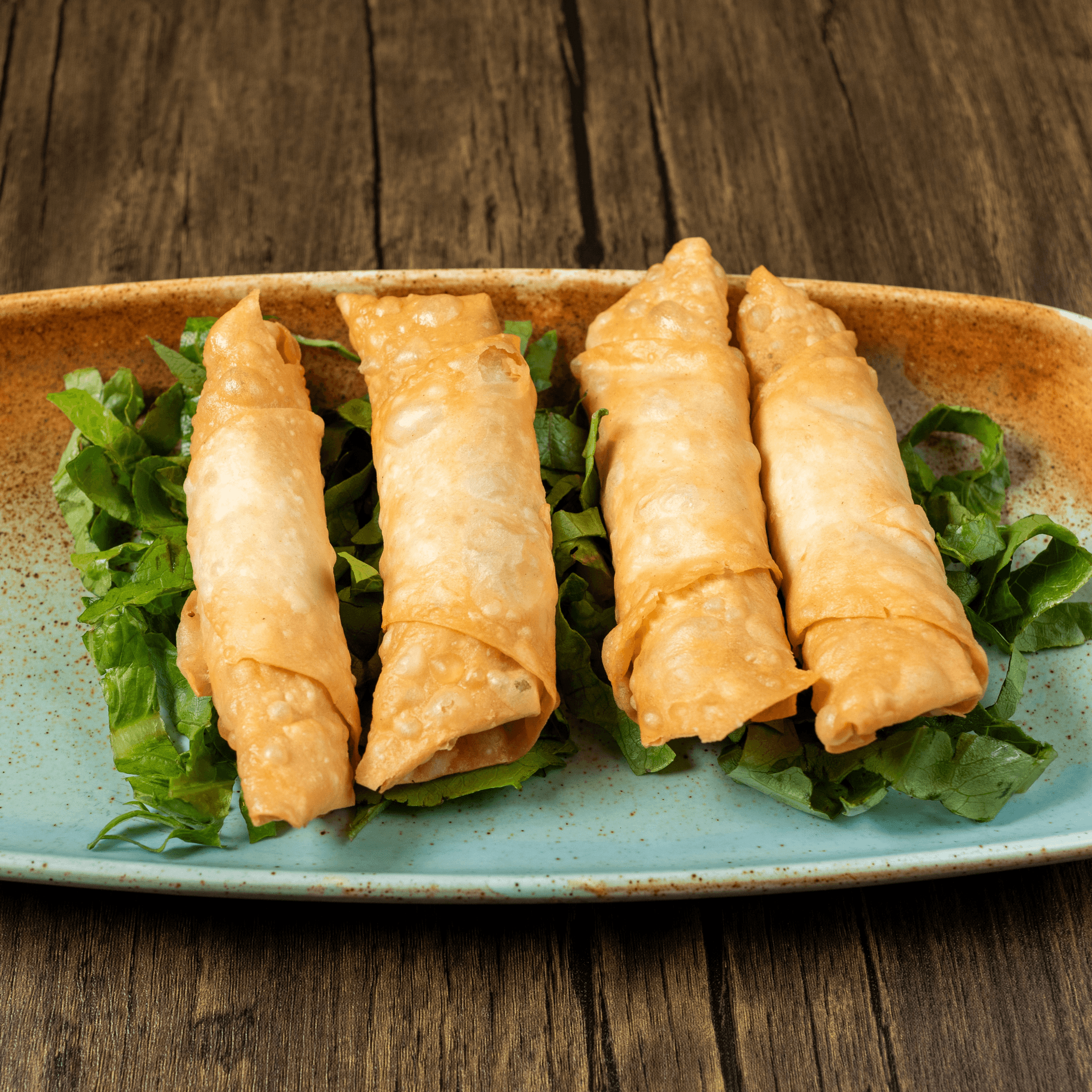 4 pieces. Thin dough filled & rolled with mild white seasoned cheese & fried.