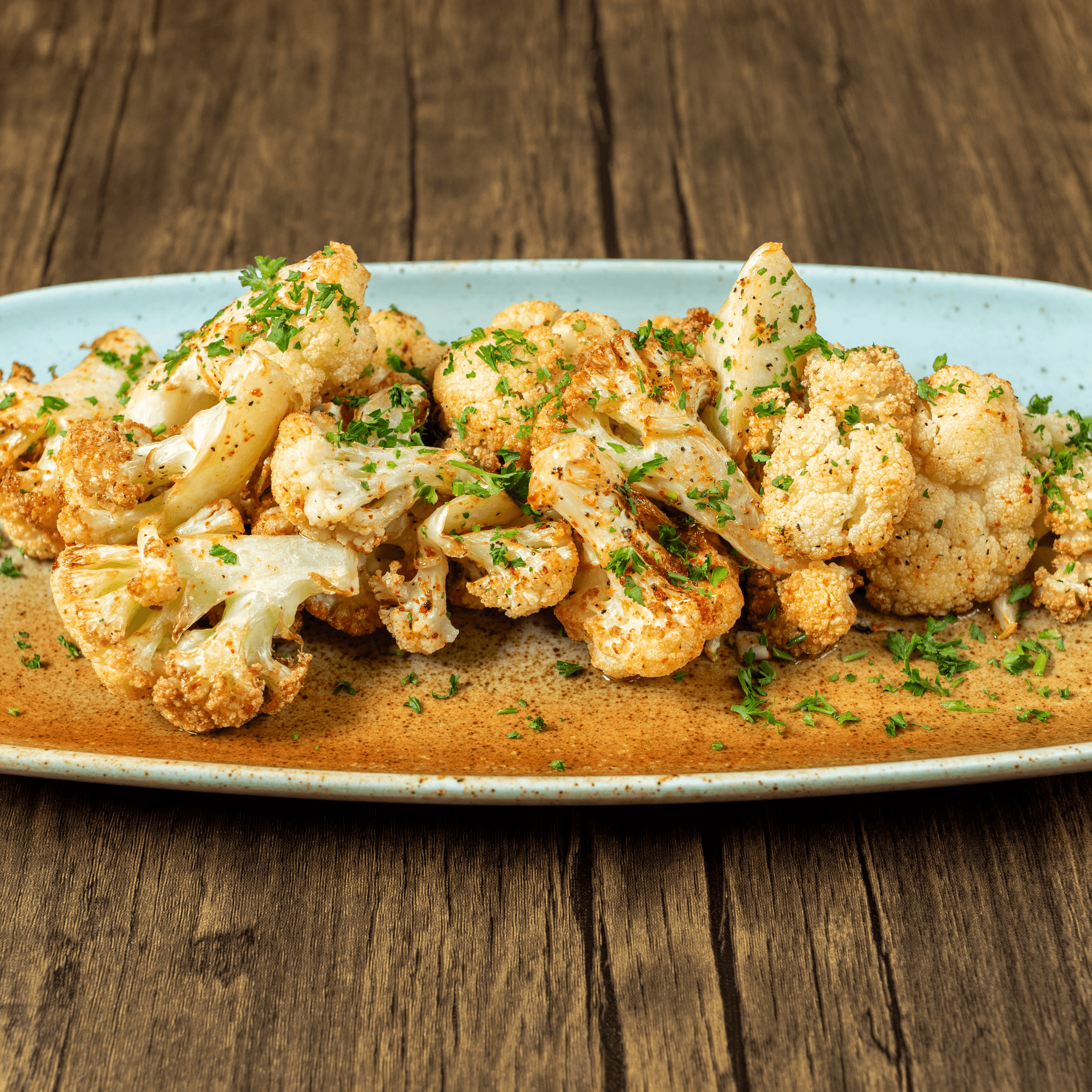 Vegan, gluten-free cauliflower. Seasoned with fresh minced garlic, parsley and spices.