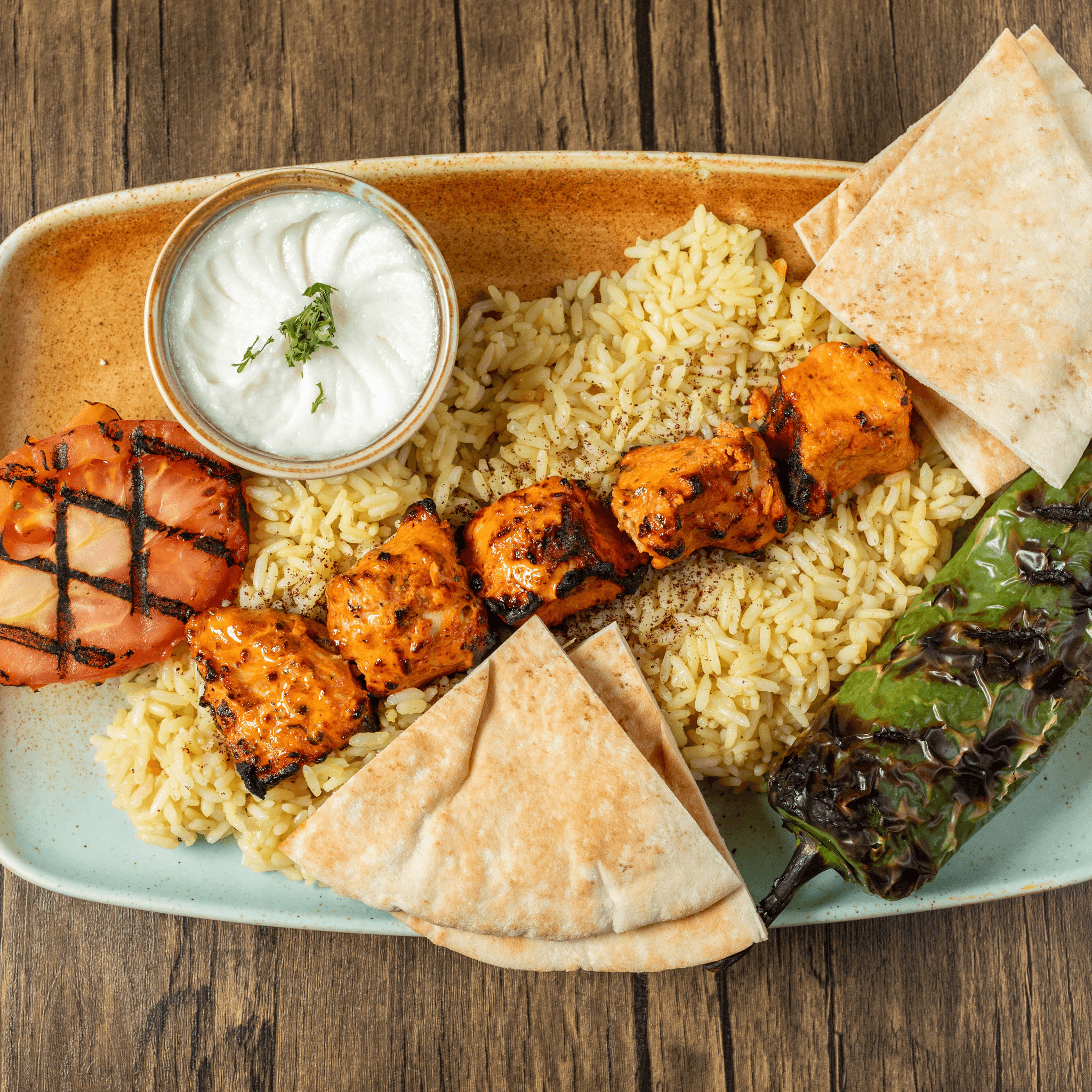 Brochette of chicken breast, marinated & grilled, served with rice pilaf & grilled vegetables