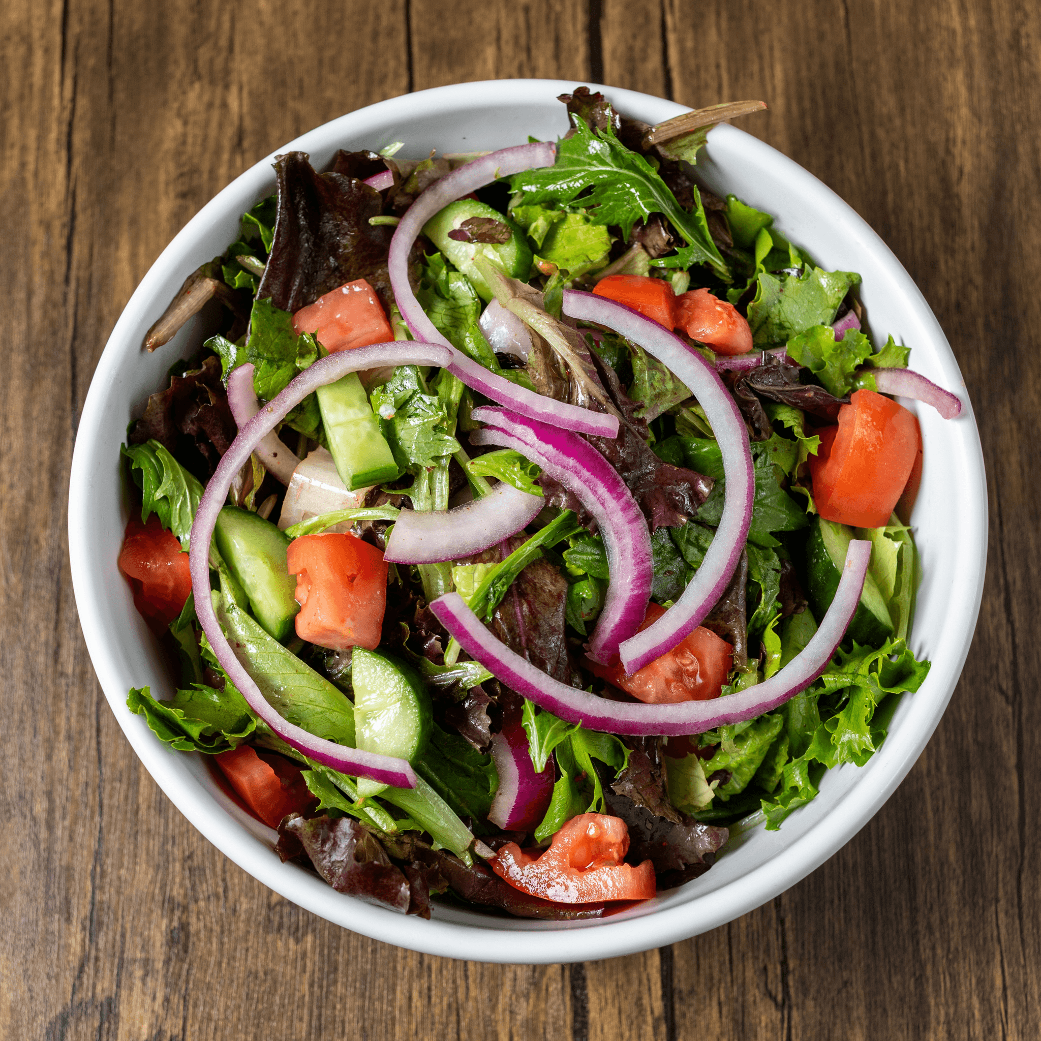 Vegan, gluten-free. Fresh romaine lettuce, tomatoes, cucumber, spring mix, and onions served with our special dressing.