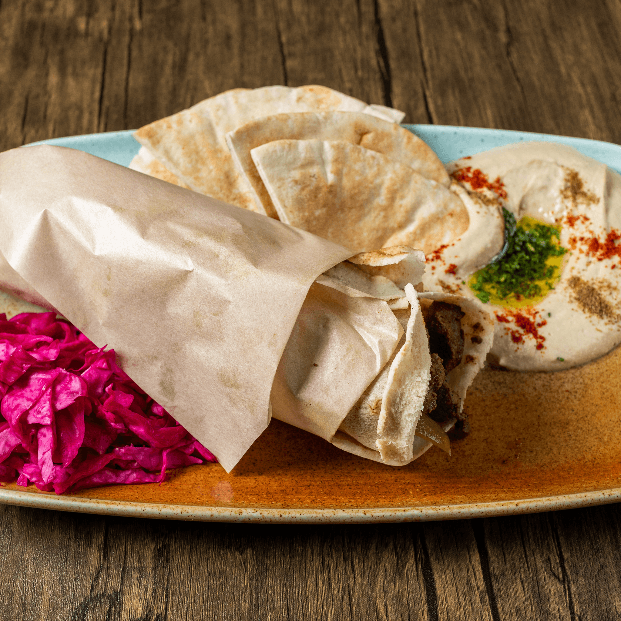 Ground filet beef mixed with onions & spices, marinated & grilled, rolled with lettuce, tomatoes & hummus