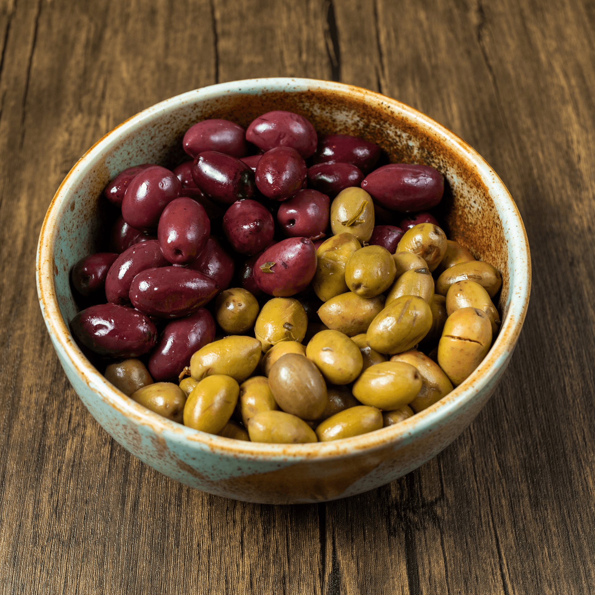 Vegan, gluten free. Black kalamata & seasoned marinated green Koura olives (non-pitted)