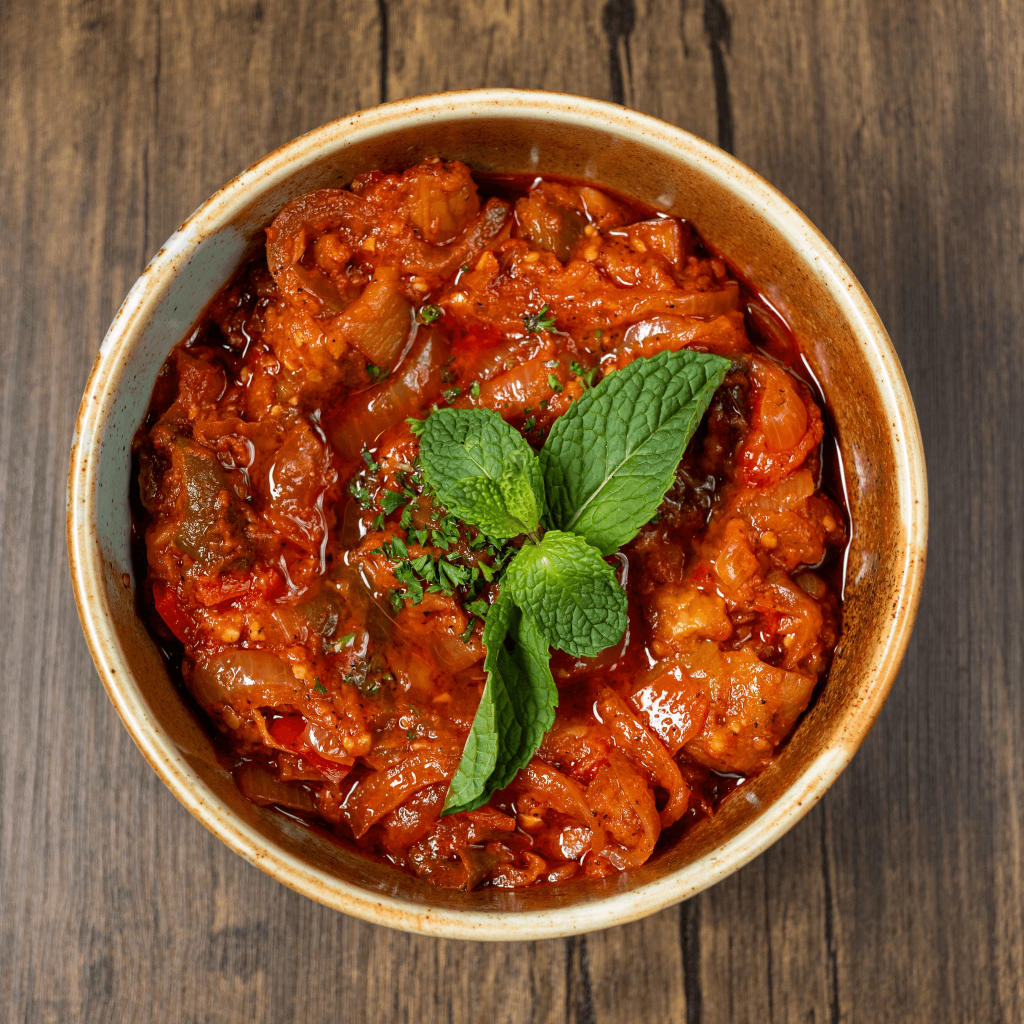 Vegetarian, gluten free. Grilled smoked eggplant mixed with sesame paste