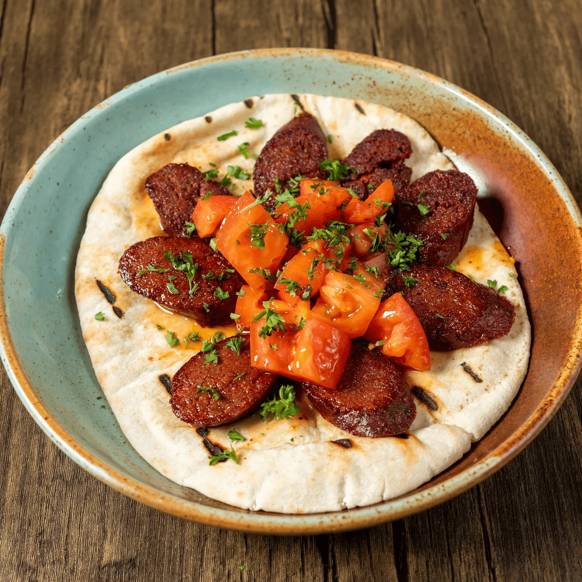8 pieces. Spicy Armenian beef sausage slices sautéed with fresh tomatoes