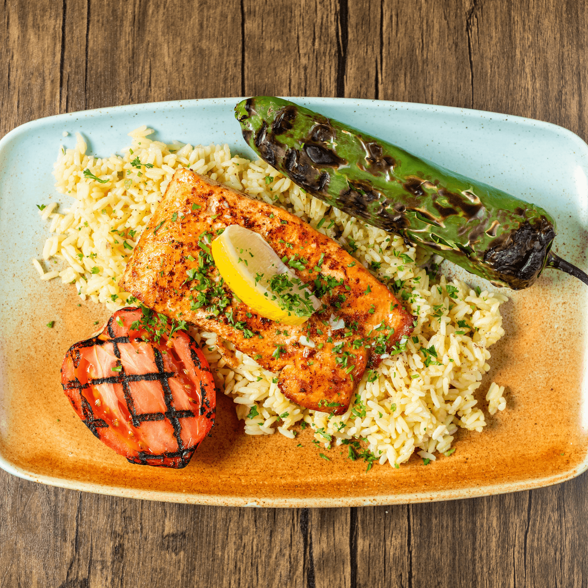 Seasoned salmon filet pan-cooked with lemon juice & garlic, served with rice pilaf & grilled vegetables