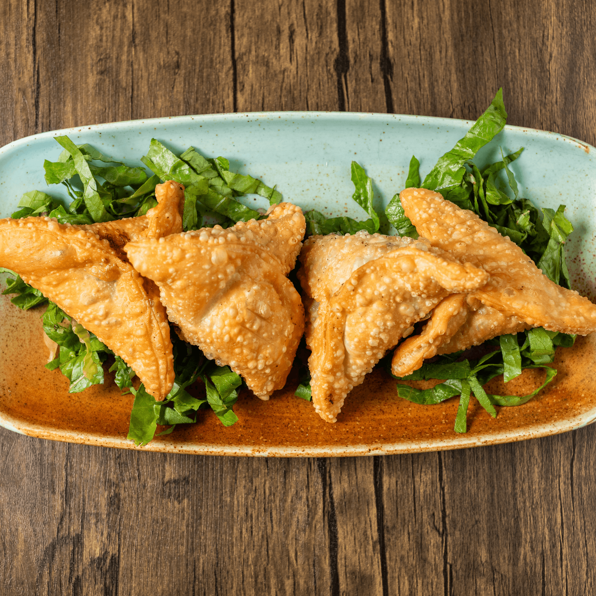4 pieces. Vegan. Mashed potato seasoned, stuffed in an empanada dough & fried.