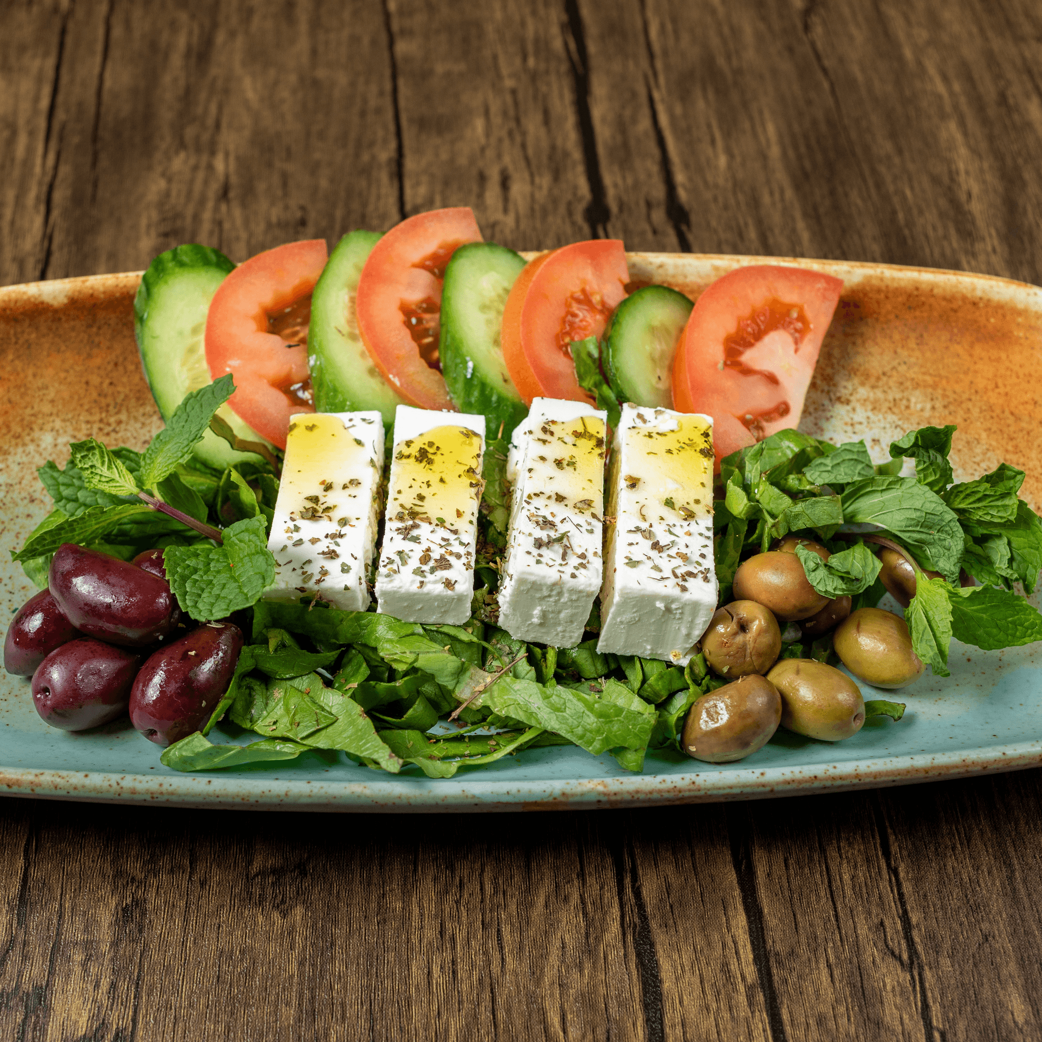 Vegetarian, gluten free. Romaine lettuce, tomatoes, cucumber, spring mix, onions, kalamata olives (non-pitted & feta cheese, olive oil & lemon juice dressing.