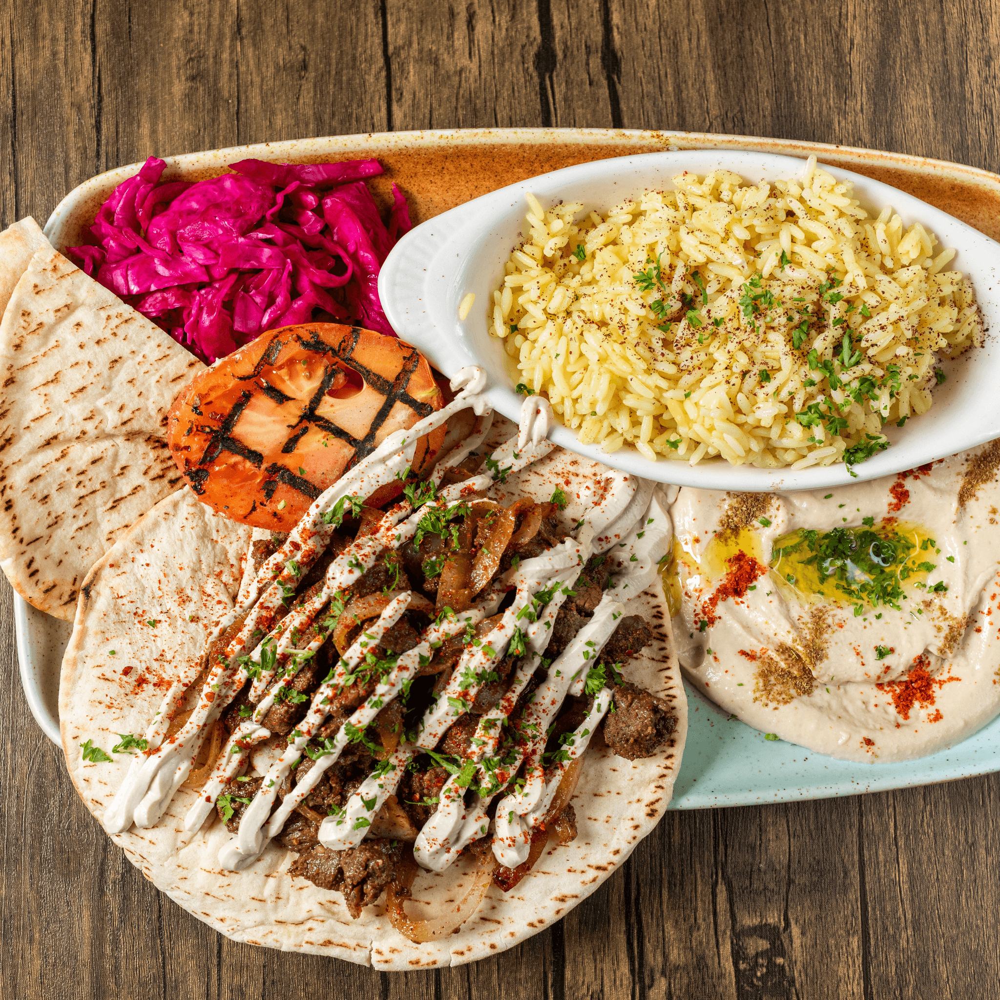 Sliced filet mignon seasoned with 7 spices, pan grilled with onions & rolled with fries, tomatoes, onions, pickles & tahini sauce