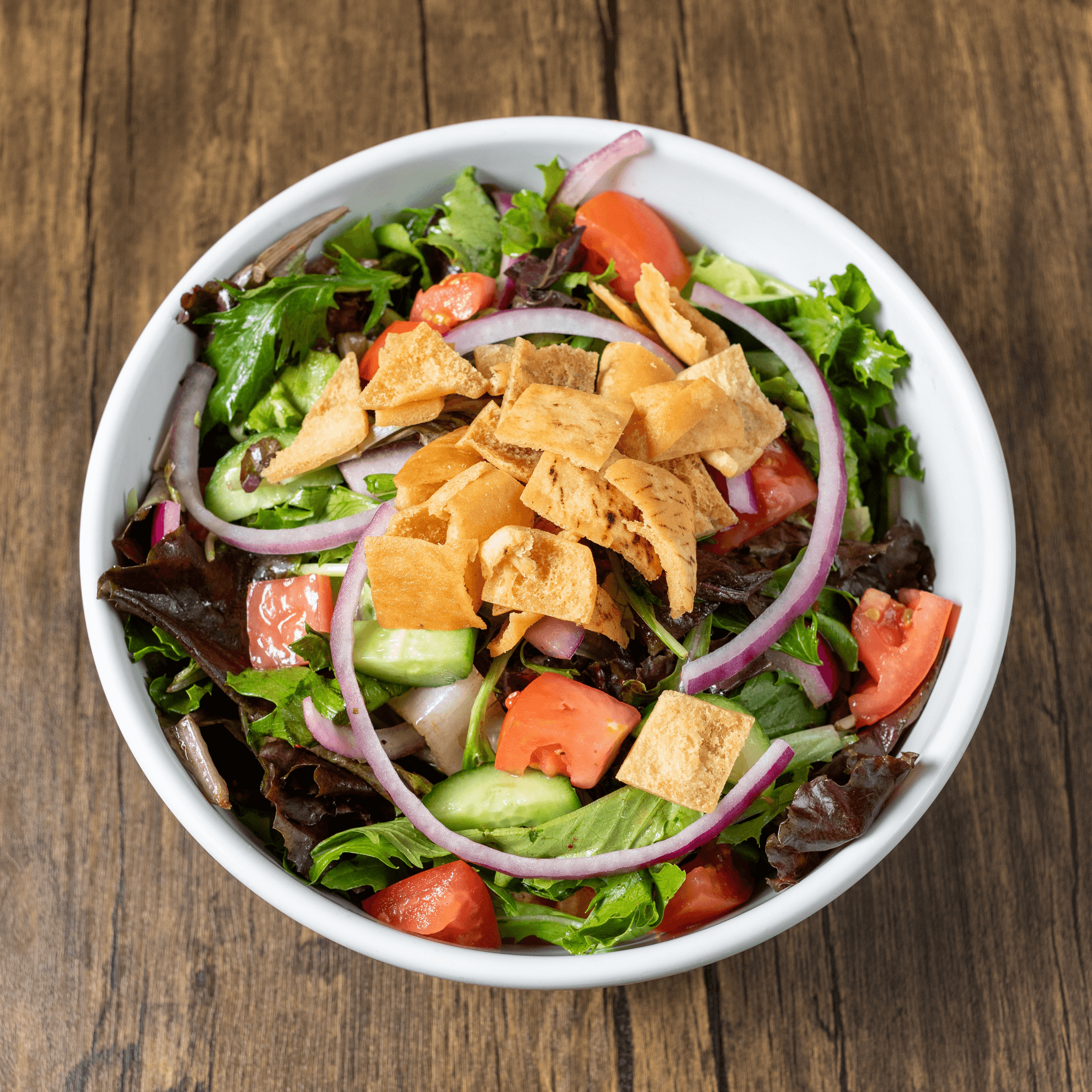 Vegan. Romaine lettuce, tomatoes, cucumbers, spring mix, onions, fresh mint, pita chips, tossed with light garlic dressing