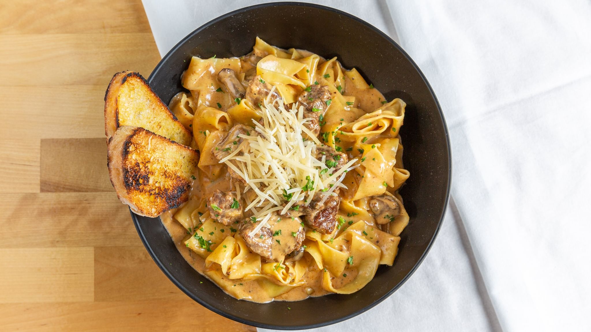Braised sirloin, egg pappardelle, mushrooms, cream